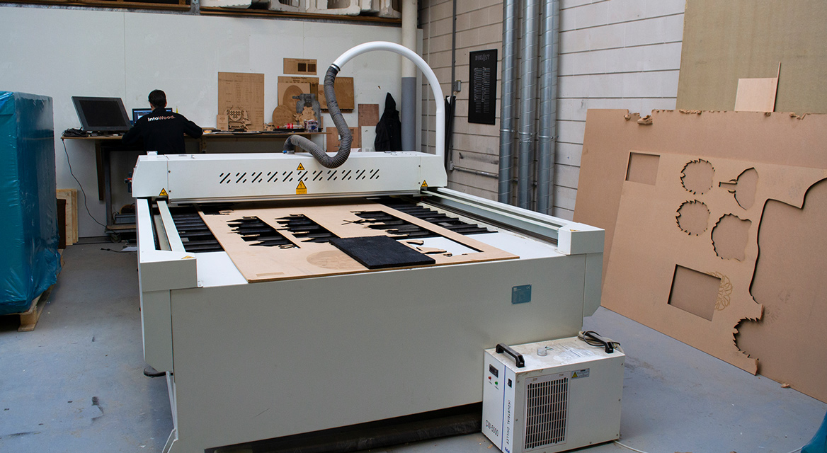 De eerste weken noemden ze bij Intowood de ‘Startfase’. “We waren veel bezig met het ontdekken van de resultaten op alle verschillende materialen en hoe we dat binnen interieurbouw konden inzetten. Je wilt de machine ontdekken en helemaal leren kennen. Natuurlijk hebben we toen de lasermachine tussendoor al wel ingezet voor kleinere projecten, maar de focus lag echt op het leren kennen van het effect op het materiaal. Dat was een ontzettend gaaf proces!” Inmiddels is de machine volop in gebruik, zeker wanneer het aankomt op projecten waar veel decoratie bij komt kijken. “De machine is een fantastische toevoeging geweest. We zijn op dit moment bezig met een nieuw project waarbij heel veel decoratie nodig is. We kunnen de lasermachine daarbij prachtig gebruiken voor het aanbrengen van permanente patronen of texturen op materialen, maar ook bij de constructie speelt de lasermachine een belangrijke rol. Door middel van het snijden van mallen kunnen zorgen we dat bepaalde decorstukken identiek zijn. Dat is erg prettig werken!”