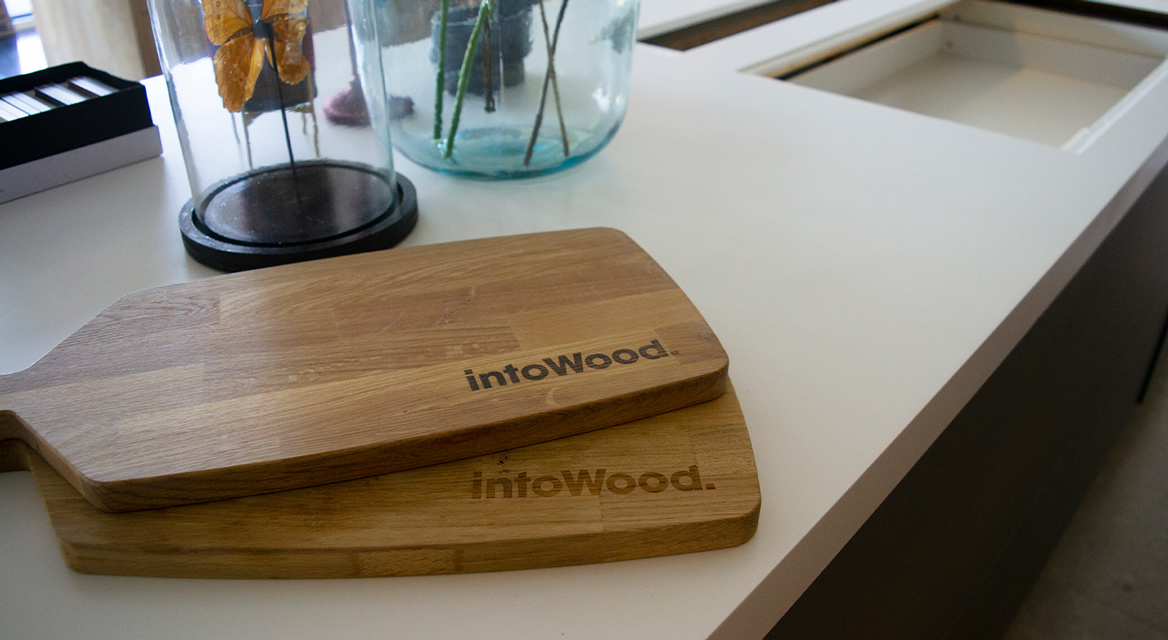 In de praktijk, en zeker binnen interieurbouw, ontstaan er vaak nieuwe mogelijkheden. Wanneer je in het begin uitgaat van hout lasersnijden, zou het zomaar eens kunnen dat je later ineens ook mogelijkheden ziet in het lasergraveren van natuursteen of lasersnijden van acrylaat. Bij Intowood hebben ze veel verschillende materialen op voorraad. Logisch ook, want de vraag van de klant is soms heel divers of de combinatie van materialen maakt het eindresultaat nóg beter. “Omdat we zo veel verschillende materialen op voorraad hebben komen we niet direct echt nieuwe materialen tegen. Wel ontdekken we steeds meer nieuwe technieken en krijgen we steeds vaker nieuwe ideeën over hoe we materialen kunnen gebruiken of bewerken met de BRM lasermachine. We kunnen er alle kanten mee op; snijplanken, skylines, uitsnijden van logo’s. Projecten waar veel decoratiemateriaal voor nodig is kunnen we in een handomdraai realiseren! Ook de behoefte van de klant om producten te personaliseren wordt heel gemakkelijk nu we de lasermachine in huis hebben”.