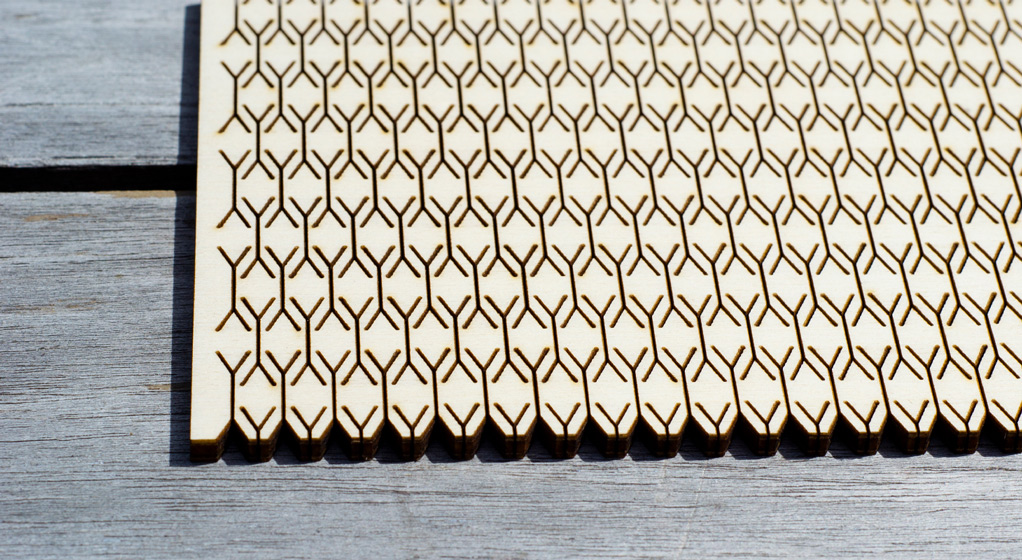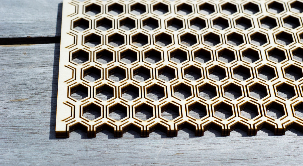 Bij een honingraatpatroon worden de verbindingen van je materiaal binnen het patroon smaller. Of, het materiaal wat je uit je patroon snijdt is groter, dat is maar net hoe je het wilt zien. Deze techniek heeft naast het buigen nog een voordeel, je kunt de plaat ook wat meer uit elkaar trekken en/of in elkaar drukken. Handig als je wat grotere stukken moet bekleden.