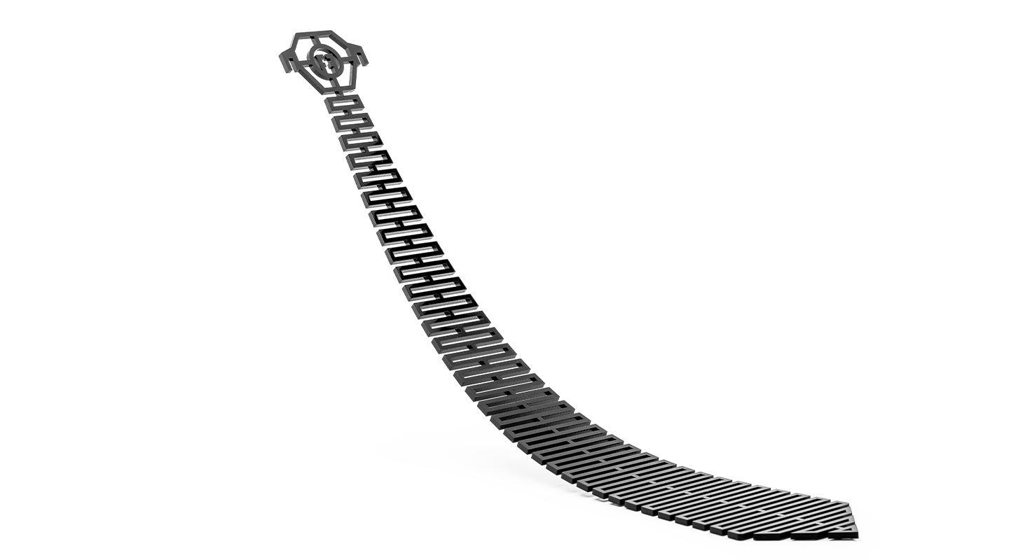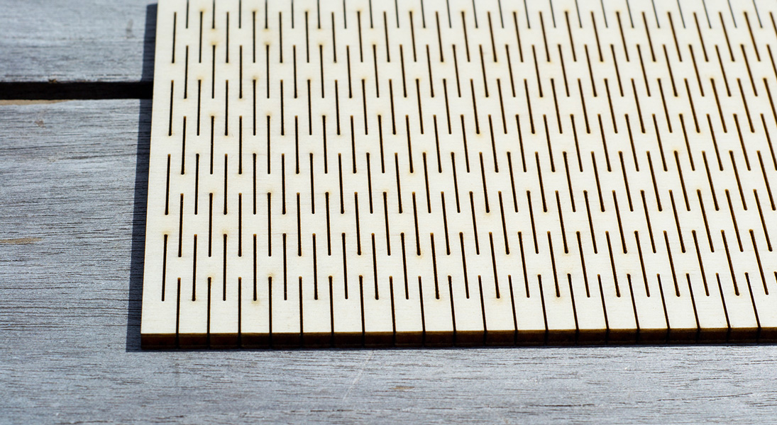 Met rechte snijlijnen maak je je plaat flexibel in één richting. Hoe verder de snijlijnen van elkaar staan, hoe beter je de plaat kunt buigen. Bij rechte snijlijnen zal het hout of acrylaat licht buigen. Dit komt omdat het materiaal door rechte snijlijnen nog steeds dicht op elkaar blijft staan.