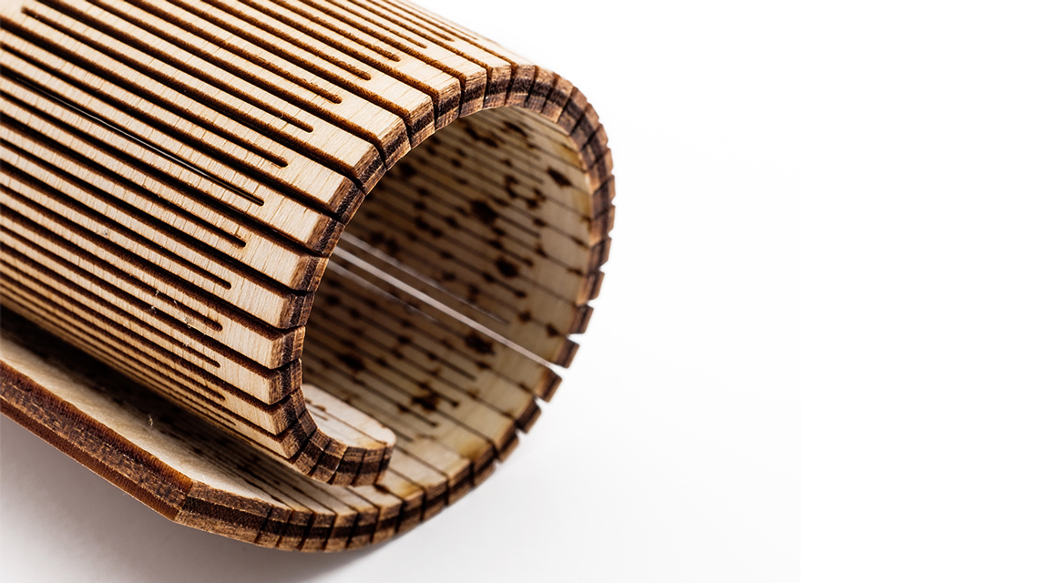 Neem hout of acrylaat. Beiden meestal te verkrijgen als plaatmateriaal, en niet erg buigbaar zonder te breken. Maar… Met het plan dat jij hebt zou het materiaal wel buigbaar moeten zijn. Hoe kun je dit materiaal dan toch gebruiken zoals jij het in je hoofd hebt? Natuurlijk kun je hout buigen door bijvoorbeeld stoom te gebruiken. Echter werkt dit weer niet voor kunststof. Een lasermachine kan je hierbij helpen!